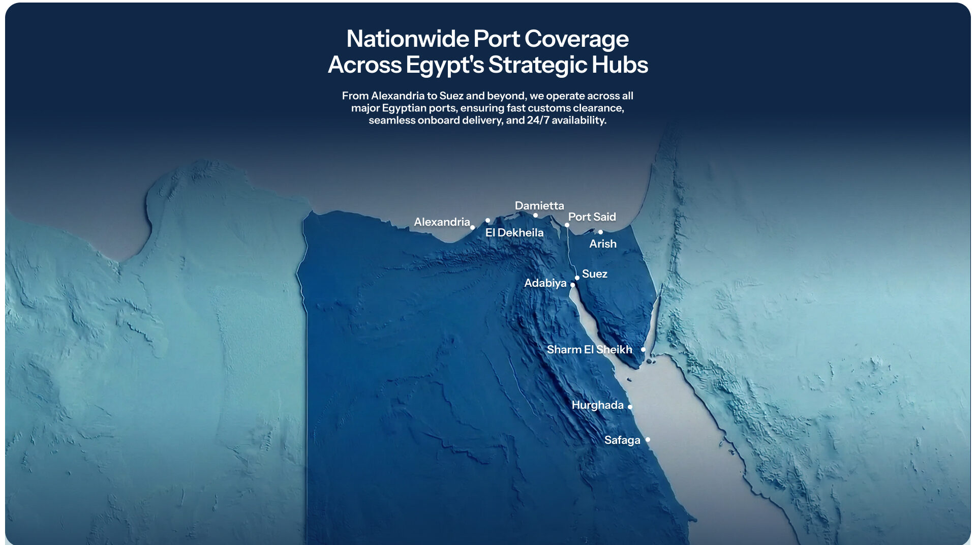 We act fast when speed matters most, serving vessels with 24/7 readiness and agile operations across all Egyptian ports.